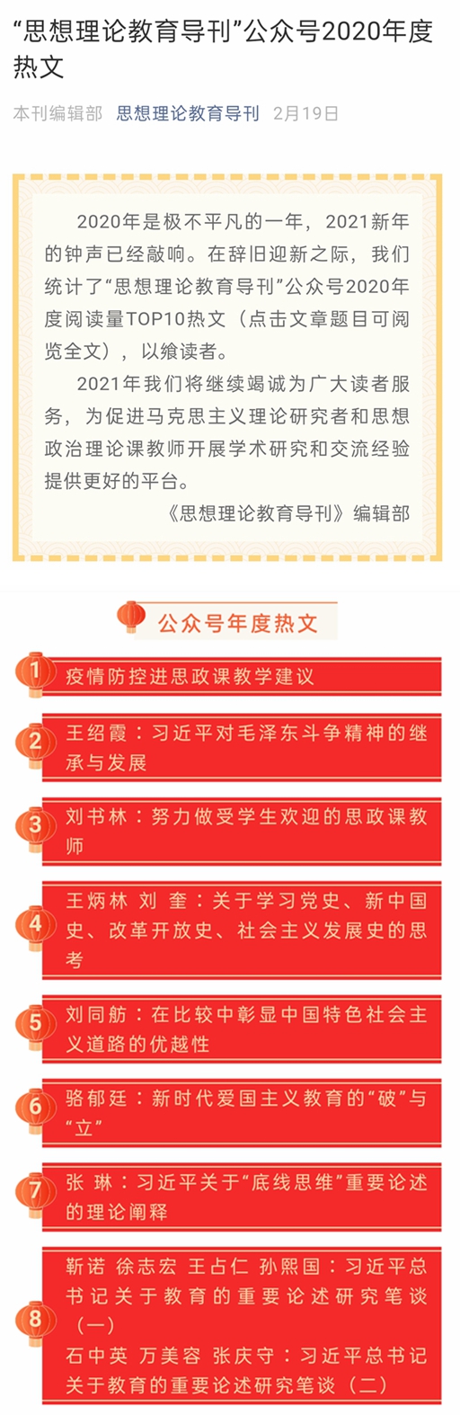 2020年12月9日,《思想理论教育导刊》刊发我院张琳教授文章:《习近平关于“底线思维”重要论述的理论阐释》,并入选“思想理论教育导刊”公众号2020年度热文。