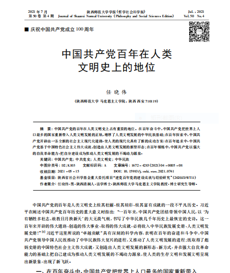 陕西师范大学学报2021年第4期刊发我院任晓伟文章:《中国共产党百年在人类文明史上的地位》。