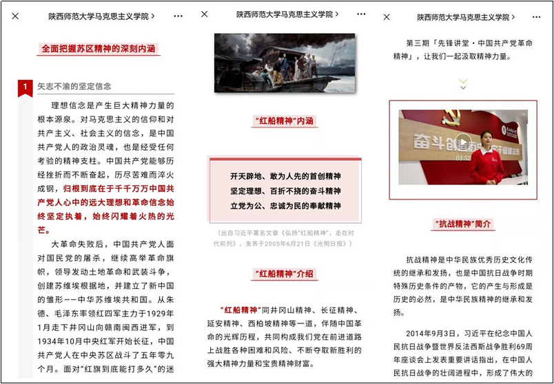 一个党员就是一面旗帜。学习和传承革命精神的形式多种多样,除了传统的课堂学习之外,互联网的飞速发展和普及也为革命精神的学习和传承提供了更加多样化的方式。先锋讲堂主要采取了各个支部党员视频解读革命精神的形式,11名党员同志在解读的过程中重点阐释了革命精神的内涵,并结合当下现实条件对这些革命精神的意义进行深刻阐释,推文以党员解读革命精神的视频并配以相应的文字和图片排版呈现。此外,各个党支部也以线下线上相结合的方式,动员支部党员积极参与到革命精神的学习中,分享和交流自己的观点、感悟,营造了学院浓厚的党史学习氛围,带动了学院师生共同学习、参与和讨论。