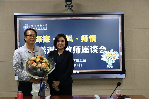 活动进行中,学院工会委员董辉副教授,副院长吴朝分别向马启民教授赠送了献花及纪念品。