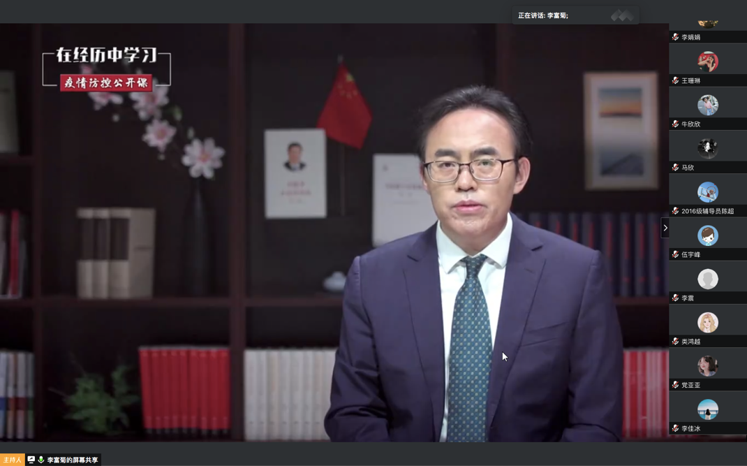 按照学院党委《关于2020年上半年党员集中学习培训的安排》的要求,为切实抓好疫情之下的党员理论学习,4月29日下午本科生第二党支部开展了主题为《新冠肺炎疫情下大学生心理健康的促进方法》的线上集体学习。此次公开课由中国科学院院士、北京大学第六医院院长陆林主讲,党支部纪检委员李富菊组织,第二党支部全体党员参加。