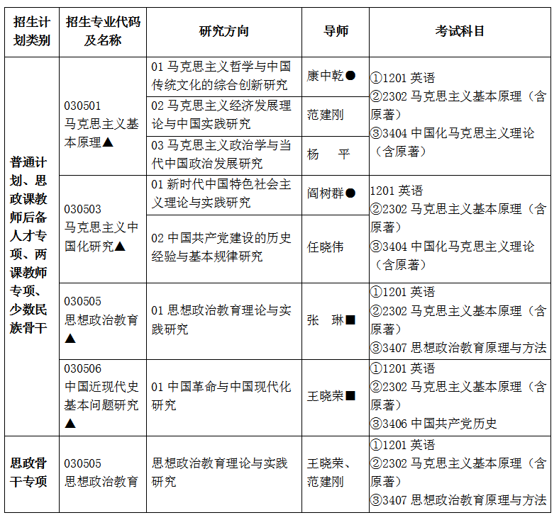 注:1.表中带“●”号的导师可招收普通计划博士生;2.表中带“■”号的导师可招收思政课教师后备人才专项博士生。3. 表中带“▲”号的专业及研究方向的导师均可招收思政课教师专项博士生、少数民族骨干博士生。
