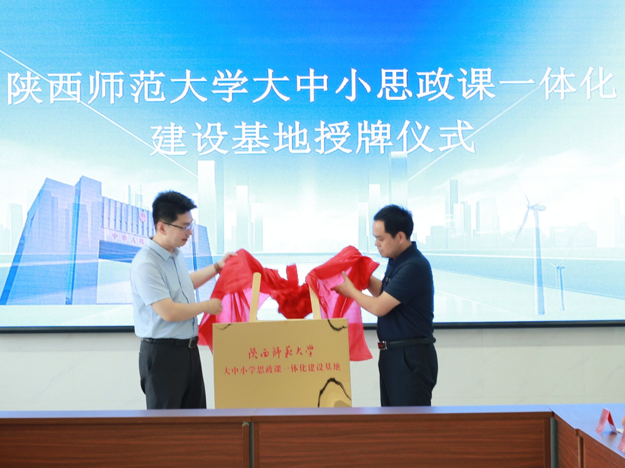 活动期间,学院向阿拉山口市中学授牌“陕西师范大学大中小学思政课一体化建设基地”,副院长殷一博,阿拉山口市委常委、组织部部长侯阿伟共同出席揭牌仪式,双方就基地未来建设、资源共享、教师培养等方面展开深入交流。