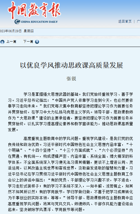 6月19日,《中国教育报》刊发学院张锐文章:《以优良学风推动思政课高质量发展》,“学习强国”学习平台转载。