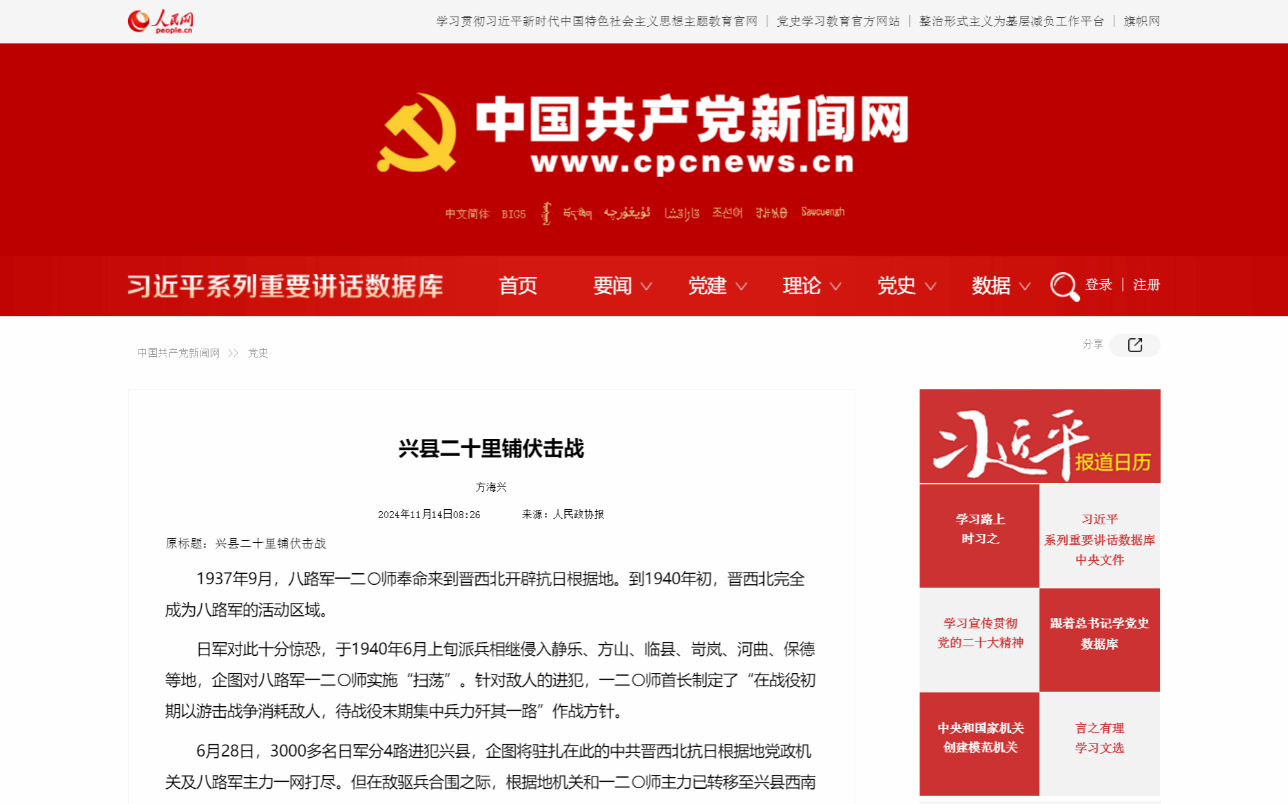 11月14日,人民网转发我院方海兴老师在《人民政协报》刊发的文章:《兴县二十里铺伏击战》。