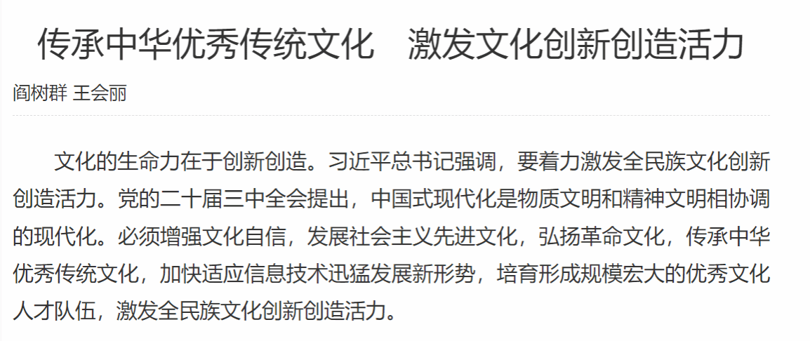 文化的生命力在于创新创造。习近平总书记强调,要着力激发全民族文化创新创造活力。党的二十届三中全会提出,中国式现代化是物质文明和精神文明相协调的现代化。必须增强文化自信,发展社会主义先进文化,弘扬革命文化,传承中华优秀传统文化,加快适应信息技术迅猛发展新形势,培育形成规模宏大的优秀文化人才队伍,激发全民族文化创新创造活力。
