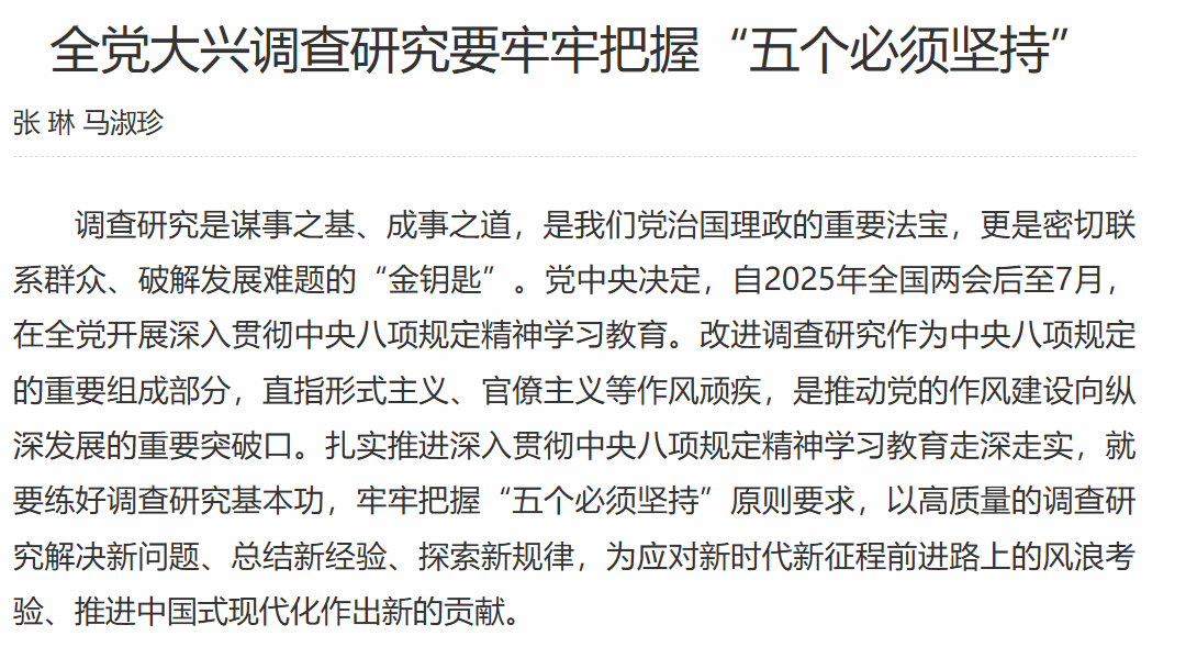 调查研究是谋事之基、成事之道,是我们党治国理政的重要法宝,更是密切联系群众、破解发展难题的“金钥匙”。党中央决定,自2025年全国两会后至7月,在全党开展深入贯彻中央八项规定精神学习教育。改进调查研究作为中央八项规定的重要组成部分,直指形式主义、官僚主义等作风顽疾,是推动党的作风建设向纵深发展的重要突破口。扎实推进深入贯彻中央八项规定精神学习教育走深走实,就要练好调查研究基本功,牢牢把握“五个必须坚持”原则要求,以高质量的调查研究解决新问题、总结新经验、探索新规律,为应对新时代新征程前进路上的风浪考验、推进中国式现代化作出新的贡献。