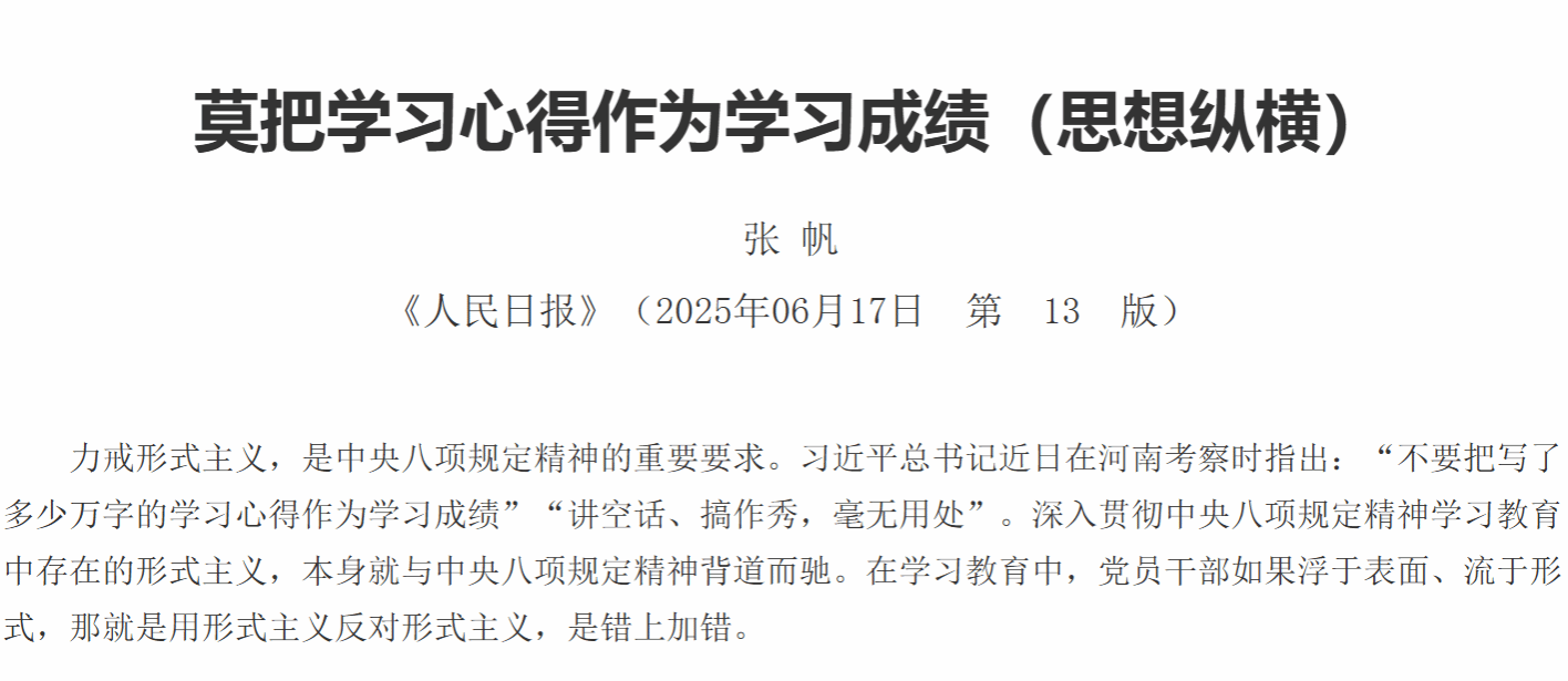 力戒形式主义,是中央八项规定精神的重要要求。习近平总书记近日在河南考察时指出:“不要把写了多少万字的学习心得作为学习成绩”“讲空话、搞作秀,毫无用处”。深入贯彻中央八项规定精神学习教育中存在的形式主义,本身就与中央八项规定精神背道而驰。在学习教育中,党员干部如果浮于表面、流于形式,那就是用形式主义反对形式主义,是错上加错。