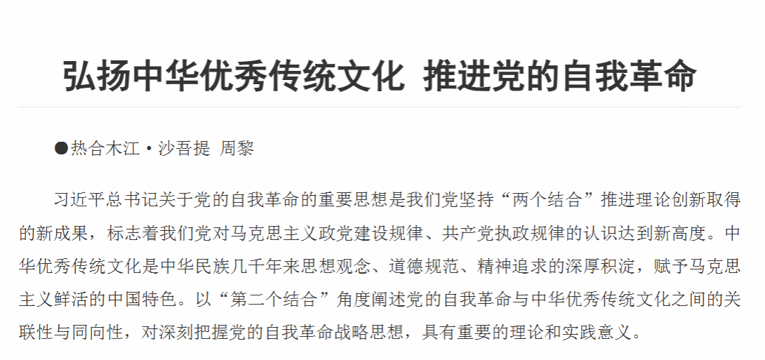 8月4日,《兵团日报》刊发学院教授热合木江·沙吾提老师文章:《弘扬中华优秀传统文化 推进党的自我革命》。