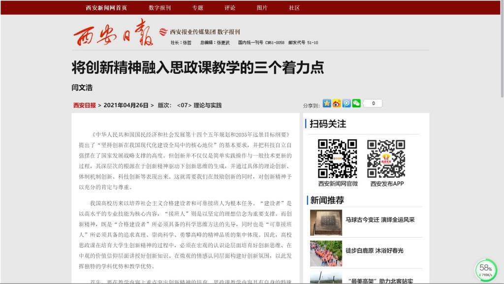 4月26日,《西安日报》刊发了我院闫文浩书记文章:《将创新精神融入思政课教学的三个着力点》。