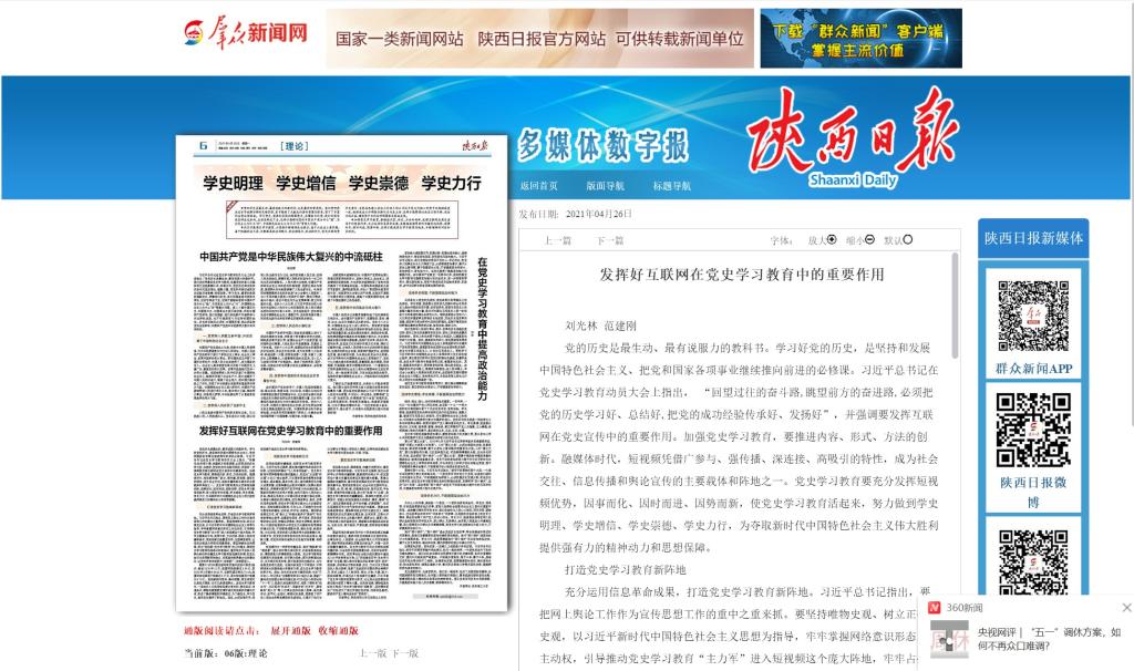 4月26日,《陕西日报》刊发我院博士生刘光林、范建刚教授文章:《发挥好互联网在党史学习教育中的重要作用》。