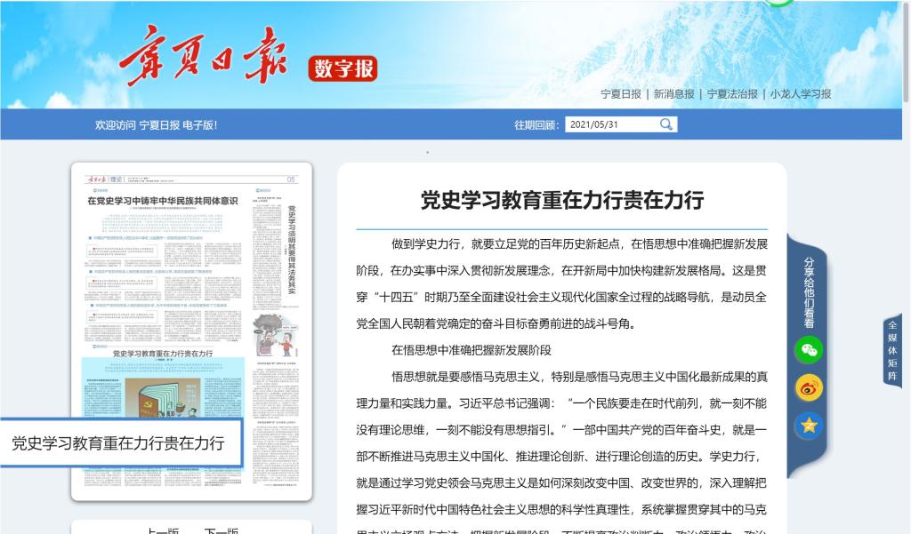 5月31日,《宁夏日报》刊发我院张琳教授、博士研究生杨继顺文章:《党史学习教育重在力行贵在力行》。