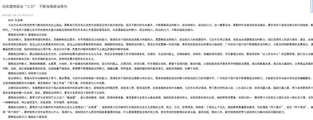 6月15日,《西安日报》刊发我院孙云教授、硕士研究生钊亚楠文章:《切实提高政治“三力” 不断加强政治修为》。