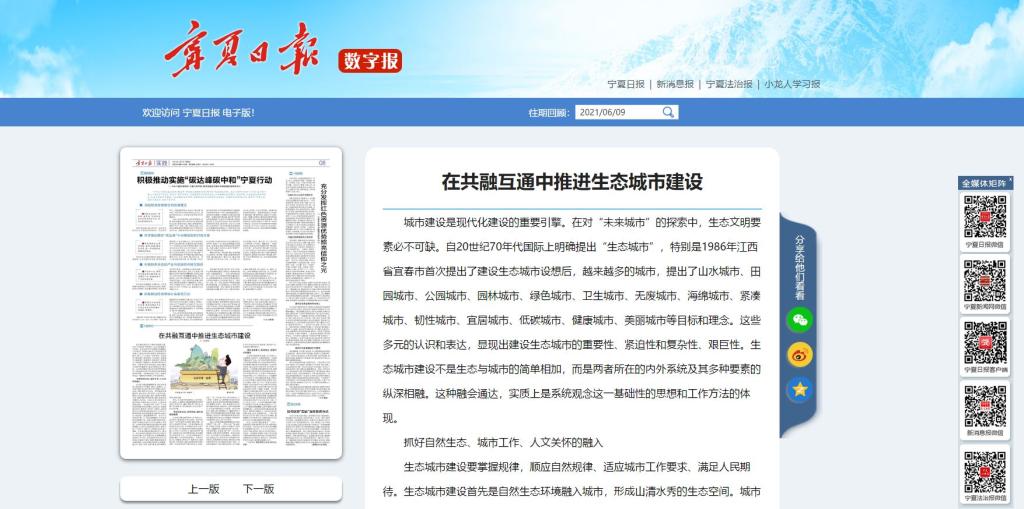 6月9日,《宁夏日报》刊发我院王东红副教授文章:《在共融互通中推进生态城市建设》。