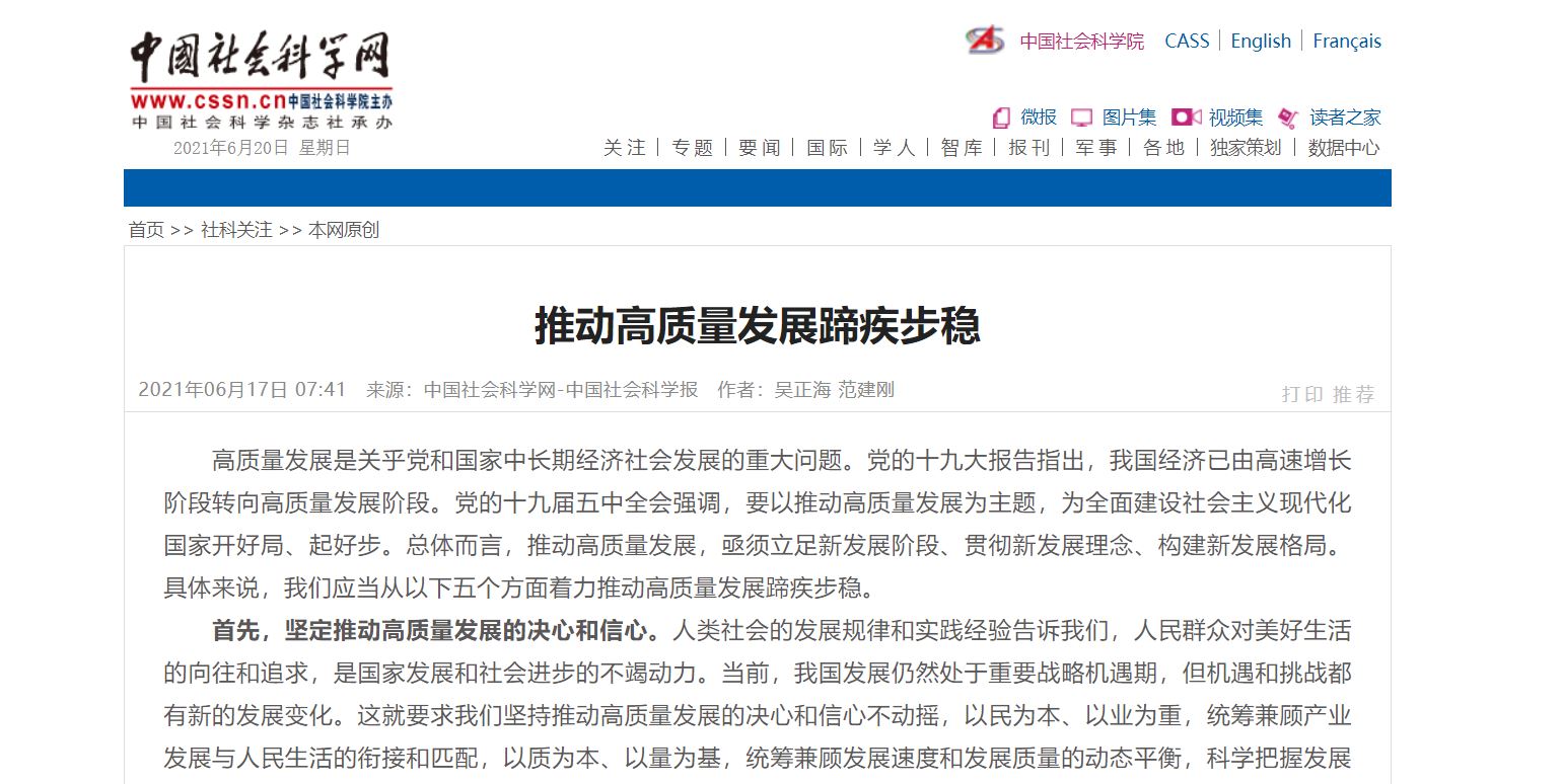 6月17日,《中国社会科学网》刊发我院吴正海、范建刚教授文章:《推动高质量发展蹄疾步稳》。
