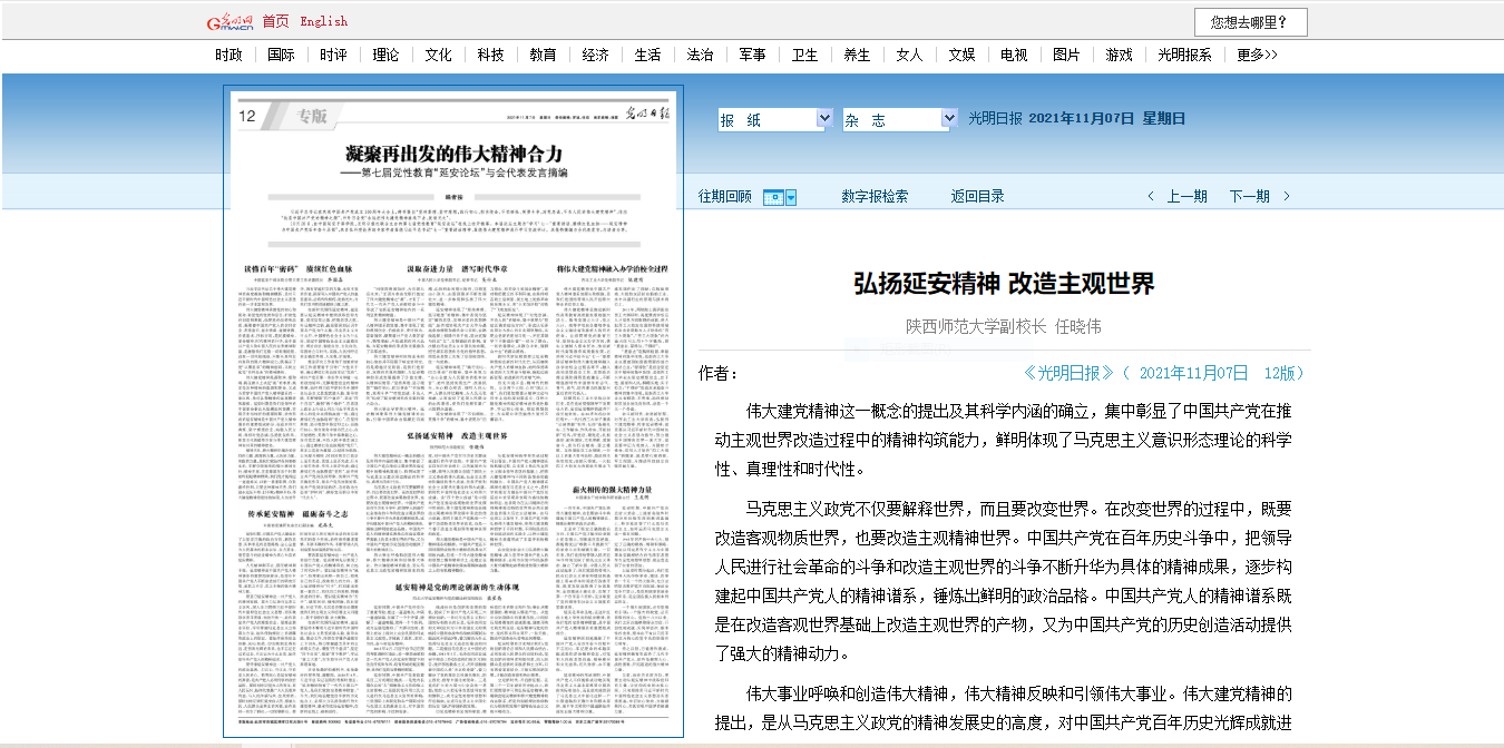 11月7日,《光明日报》刊发我校副校长、我院任晓伟教授文章:《弘扬延安精神 改造主观世界》。