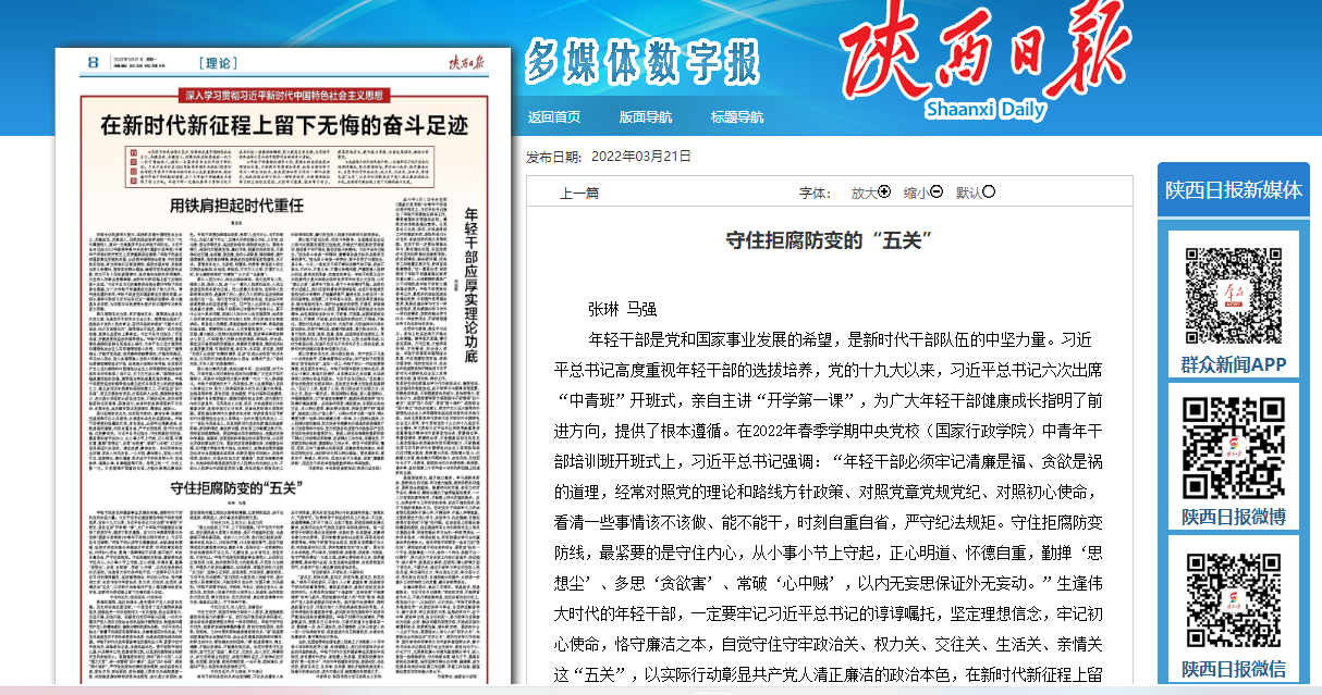 3月21日,《陕西日报》刊发我院副院长张琳教授、博士研究生马强文章:《守住拒腐防变的“五关”》。