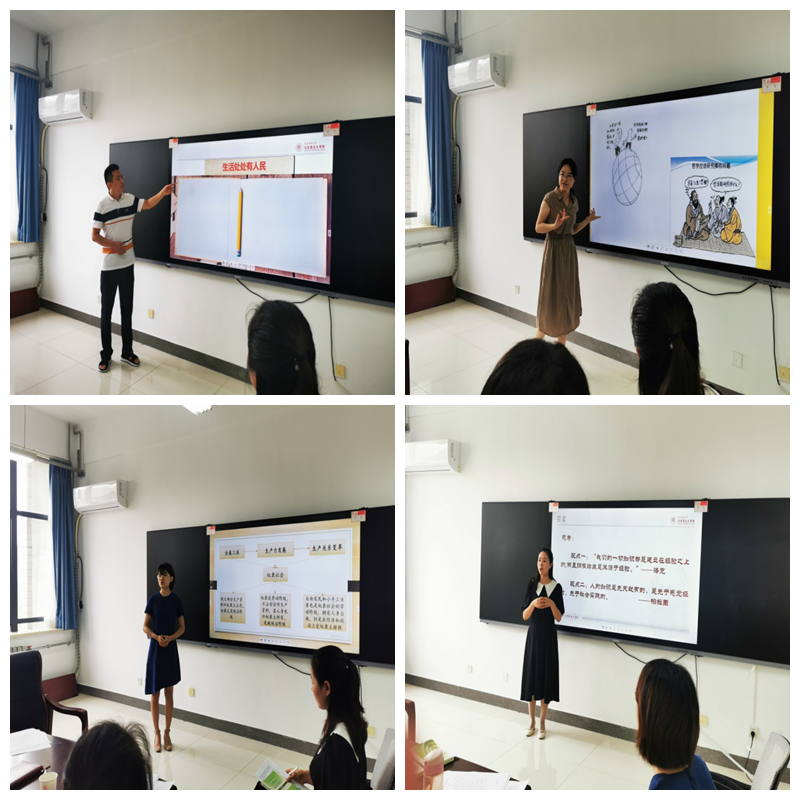 首先,在思政课“大练兵”活动中,张鹏、王媛、李娟仙和雪婷四位老师分别做了主题为《人民群众是历史的创造者》、《资本主义经济制度的产生》、《由感性认识向理性认识的能动飞跃》和《哲学的基本问题》的教学展示。康中乾老师从选题的角度、范建刚老师从切中生活的维度、郭瑞萍老师从导课的视角、孙萌老师从授课方式的特点、张晓燕老师从互动效果的形式出发对教学展示的老师给出了很多宝贵和中肯的建议。