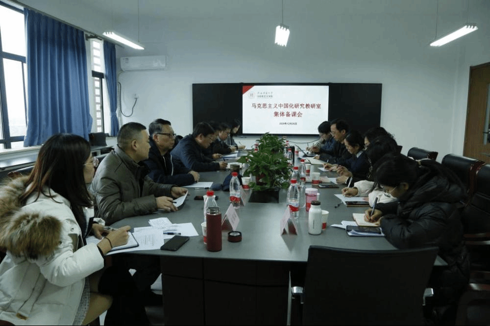 为进一步学习贯彻十九届五中全会精神,深入推动习近平新时代中国特色社会主义思想的“三进”工作走深走实,构建领导带头开好课、学院带头备好课、教师带头讲好课的我校思政课建设新格局,校长游旭群于2020年12月25日上午在文澜楼1515室参加了我院马克思主义中国化研究教研室集体备课会。备课会由教研室主任李后东主持,学院党委书记闫文浩及教研室全体教师参加了此次备课会。