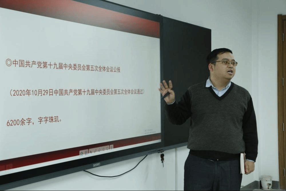 备课会主要分三个环节进行。首先,张帆老师作“十九届五中全会精神学习辅导”。他紧密结合思想政治理论课教学实践,对十九届五中全会精神进行全方位解读,重点阐述了十九届五中全会精神融入思想政治理论课必须讲清楚的十大问题。阎树群教授在对张帆老师的讲解进行客观点评的基础上,重点就新发展阶段、新发展理念、新发展格局的“三新”问题做出深入剖析,并且从讲好思政课的角度对十九届五中全会的精神进行了系统阐述与深入解读。