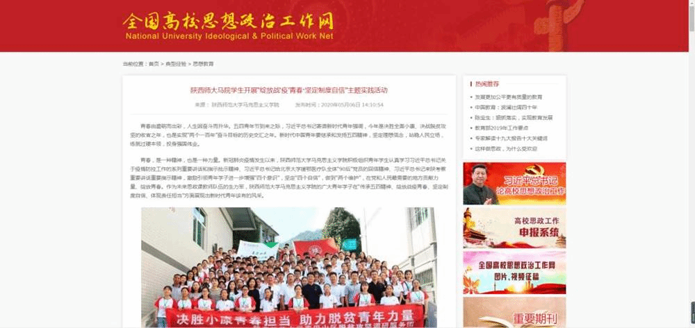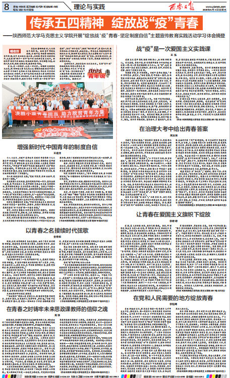 青春由磨砺而出彩,人生因奋斗而升华。五四青年节到来之际,习近平总书记寄语新时代青年强调,今年是决胜全面小康、决战脱贫攻坚的收官之年,也是实现“两个一百年”奋斗目标的历史交汇之年。新时代中国青年要继承和发扬五四精神,坚定理想信念,站稳人民立场,练就过硬本领,投身强国伟业。2020年5月6日,《西安日报》整版刊发我院本科生关于“绽放战疫青春·坚定制度自信”主题宣传教育实践活动学习体会。七篇学习体会文章从不同的视角展现了未来思政课教师生力军在“传承五四精神、绽放战‘疫’青春”方面的思考,在“坚定制度自信,砥砺爱国信仰”方面的担当。文章刊发后,全国全国高校思想政治工作网全文转载。